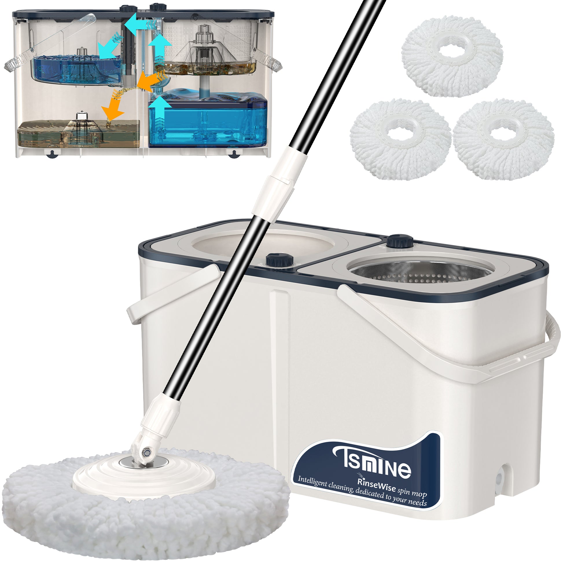 - Clean and Dirty Water Separate System for Maximum Hygiene - The Tsmine RinseWise spin mop features a cutting-edge separate clean and dirty water system,this ingenious design ensures effortless and effective cleaning, making it a go-to choice for pet owners, seniors, and those with busy schedules,say hello to pristine floors with ease.